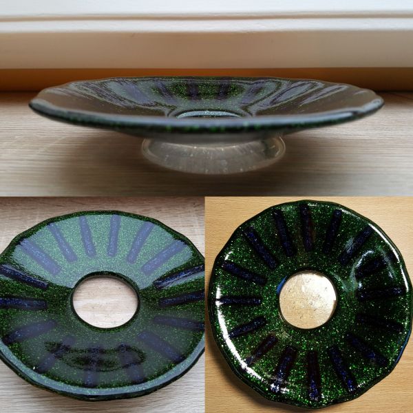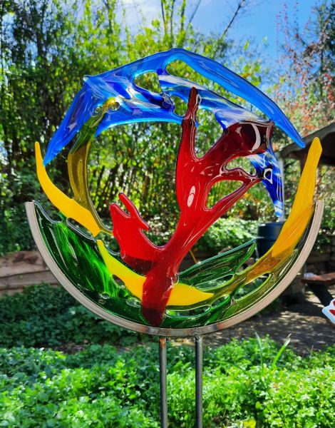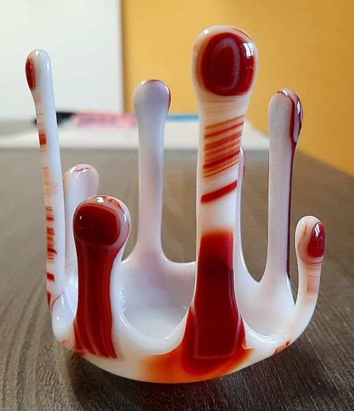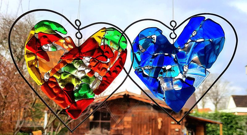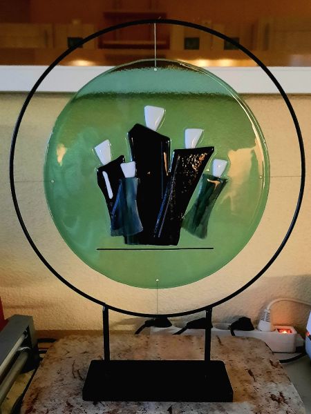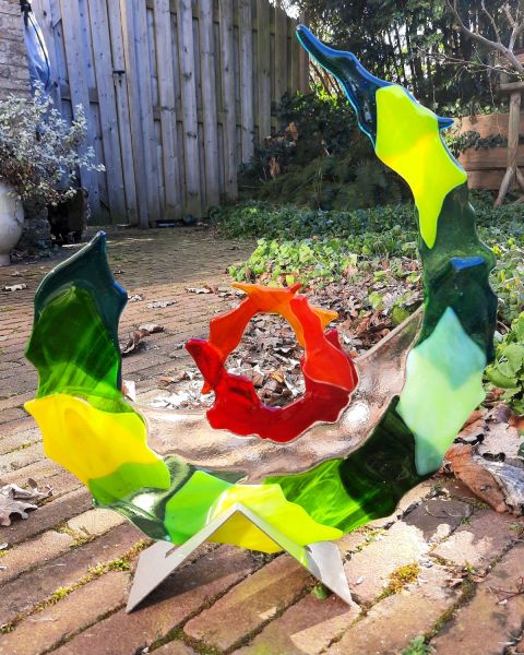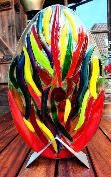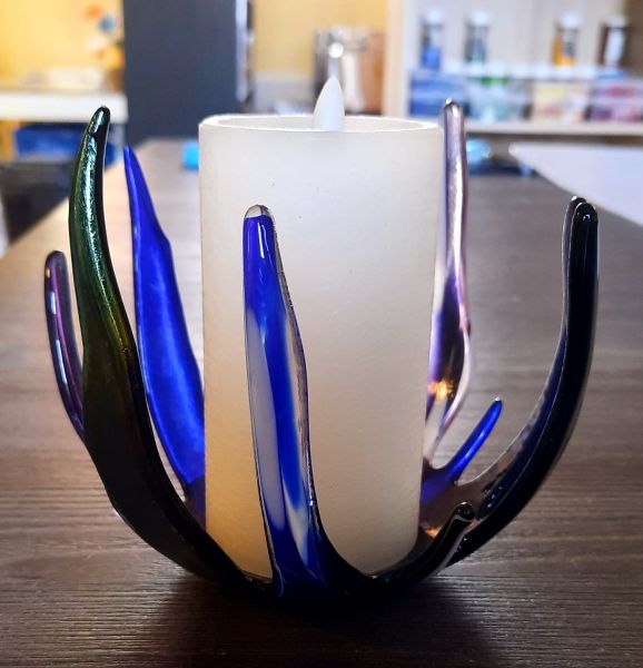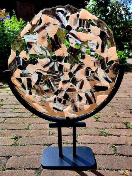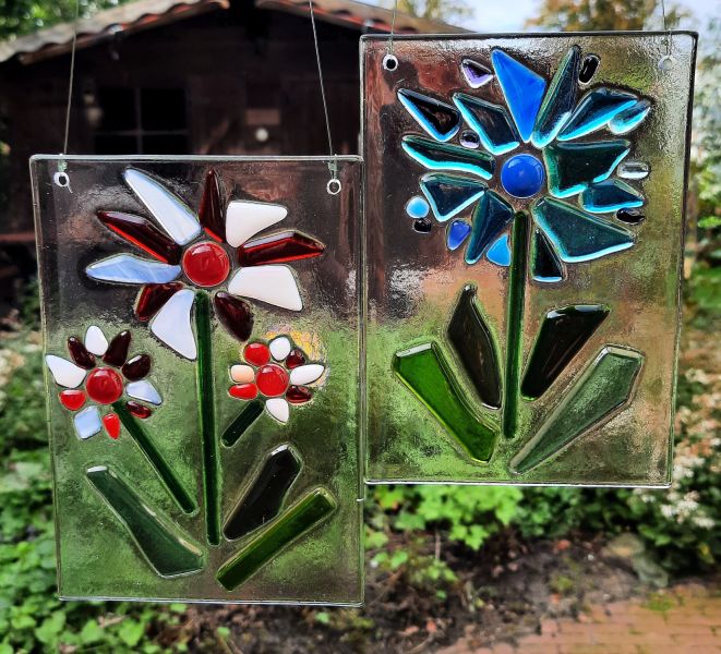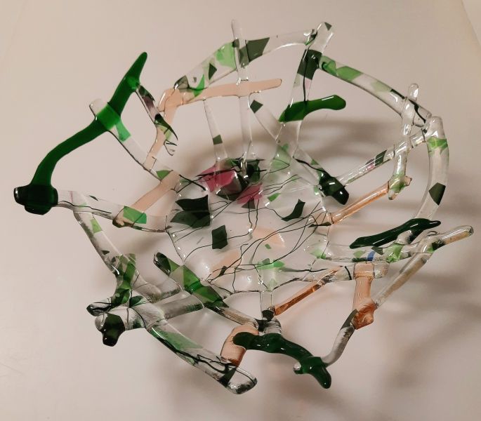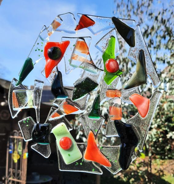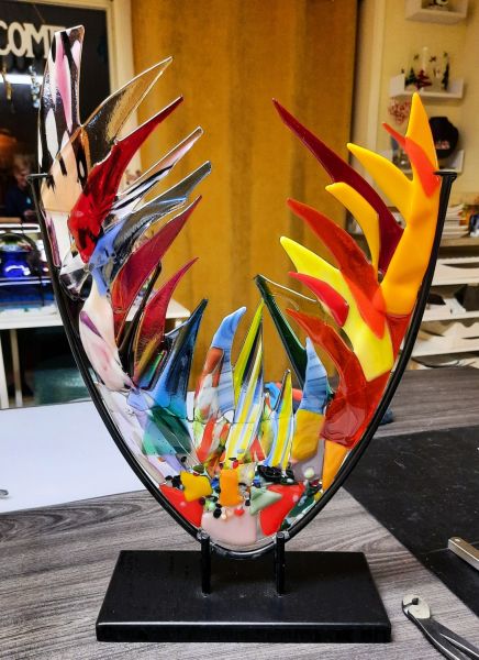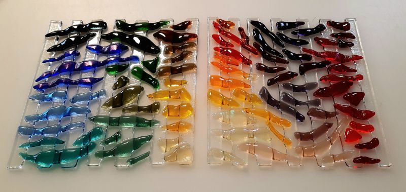Glasfusion is het versmelten van glas in een glasoven op hoge temperaturen. Hoe hoger de temperatuur, hoe verder de stukken glas met elkaar versmelten. Met die wetenschap laat ik mijn fantasie de vrije loop: schalen, kaarsenhouders, hangende of staande objecten, halskettingen, maar ook originele geboorte-aandenkens en herinneringsborden.